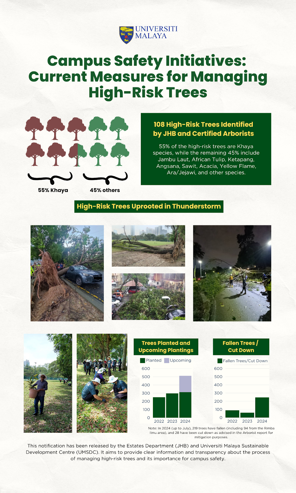 Note: This notification has been released by the Estates Department (JHB) and Universiti Malaya Sustainable Development Centre (UMSDC). It aims to provide clear information and transparency about the process of managing high-risk trees and its importance for campus safety.