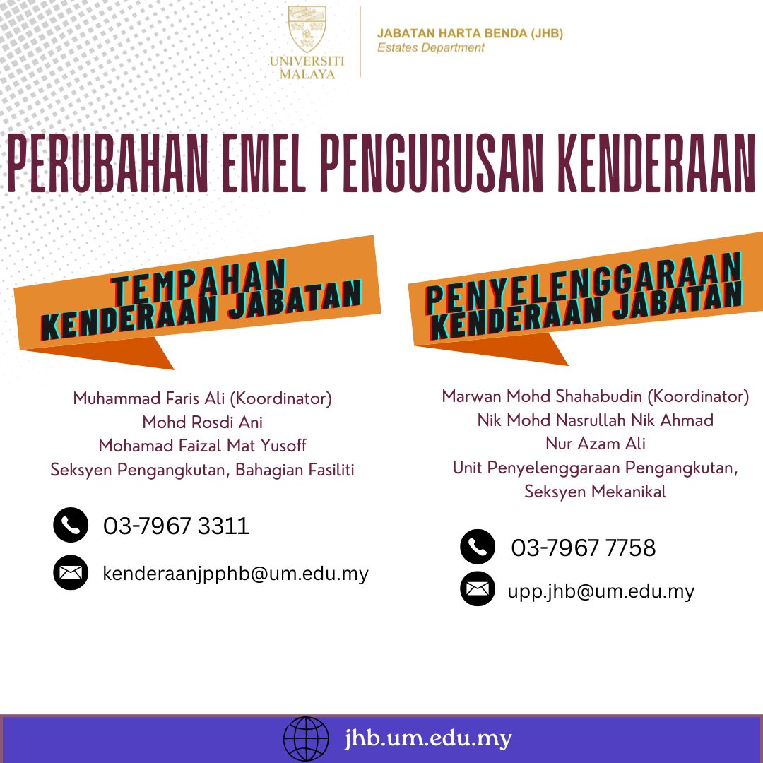 Sukacita dimaklumkan bahawa Jabatan Harta Benda (JHB) telah menetapkan penggunaan dua (2) alamat emel rasmi bagi sebarang urusan berkaitan dengan Pengurusan Kenderaan seperti berikut: