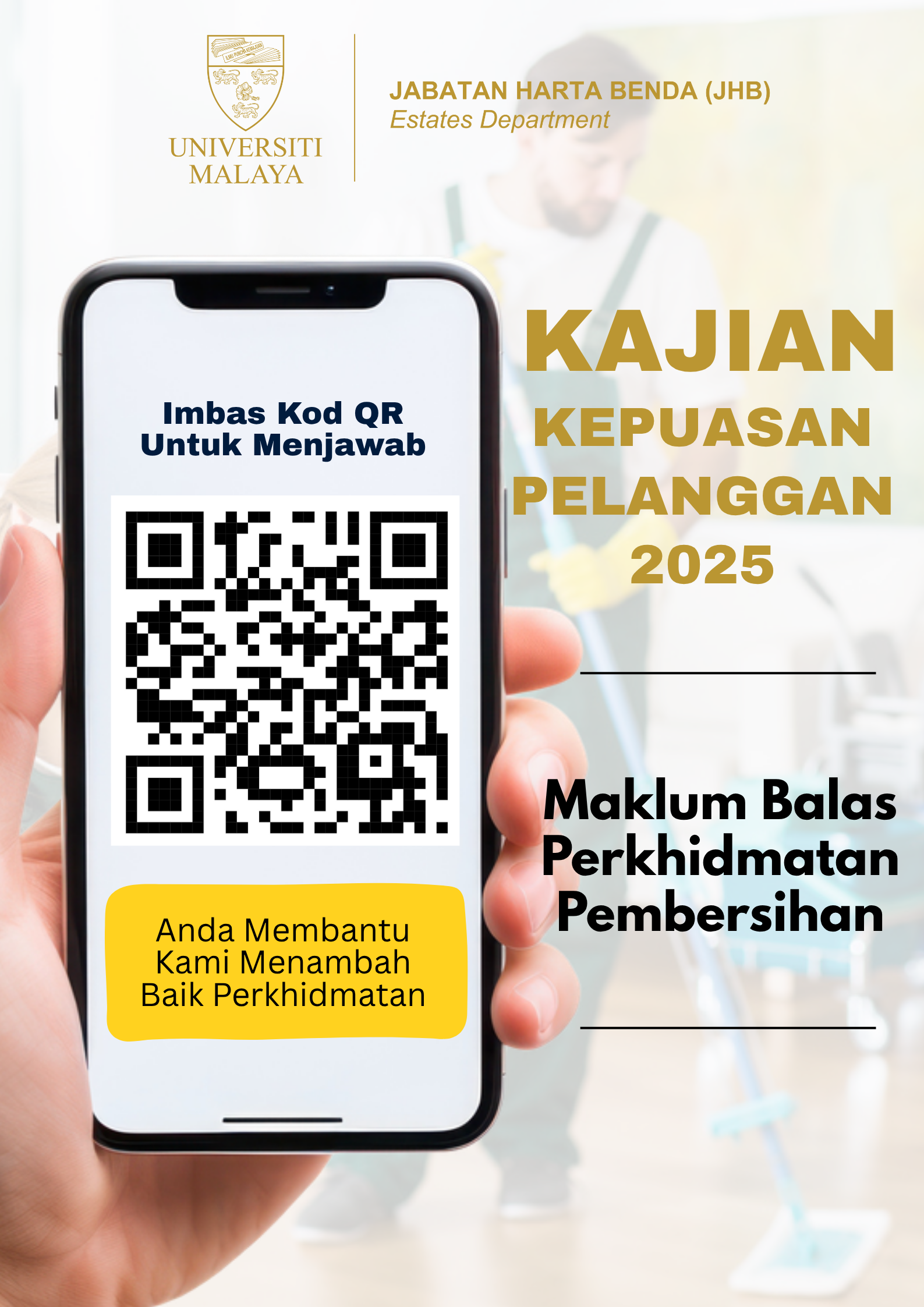 Bahagian Fasiliti, Jabatan Harta Benda (JHB) sentiasa berusaha untuk meningkatkan kualiti perkhidmatan pembersihan di Universiti Malaya. Sehubungan itu, satu Kajian Kepuasan Pelanggan bagi tahun 2025 telah disediakan.