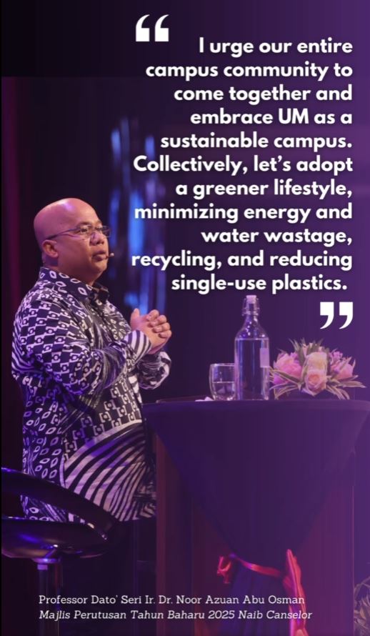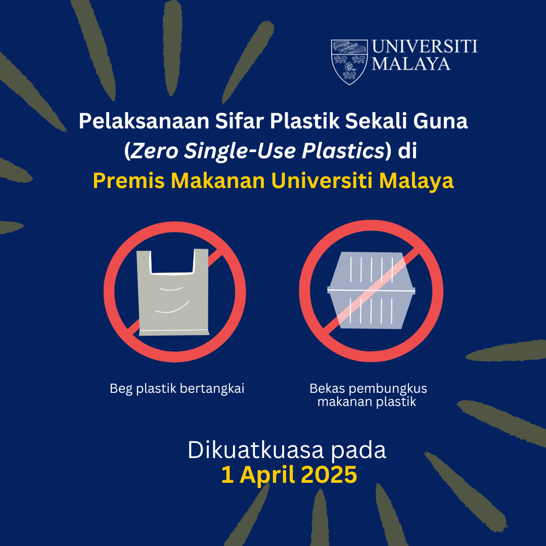 Surat Pekeliling Am Bilangan 6 Tahun 2024, Universiti Malaya menyokong penuh hasrat yang telah dinyatakan ini. Usaha ini juga selari dengan Pelan Strategik Sifar Bersih Universiti Malaya: Neutral Karbon menjelang 2030 dan Amanat Perutusan Tahun Baharu 2025 Naib Canselor Universiti Malaya yang menyeru seluruh warga Universiti Malaya untuk bersama-sama mendukung aspirasi ini secara kolektif.