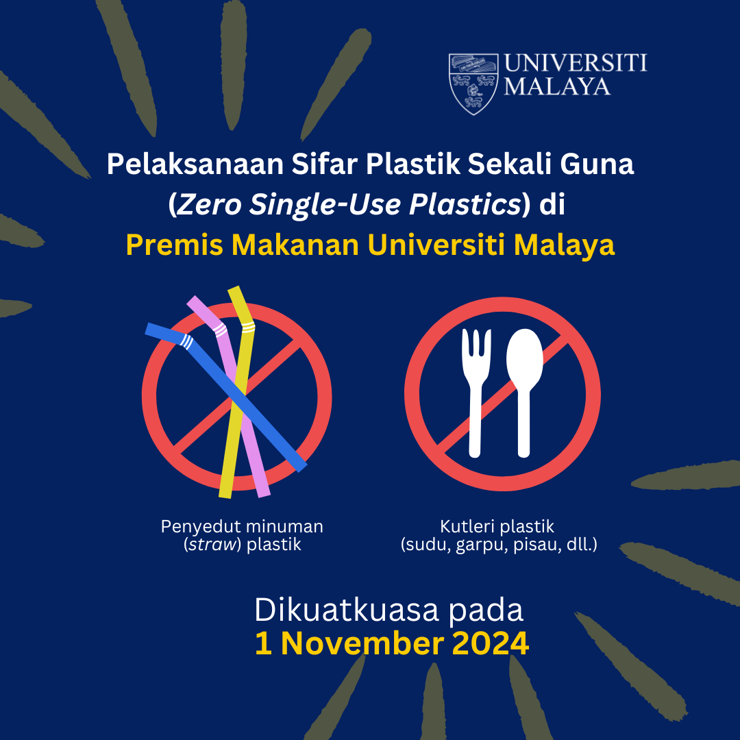 Oleh itu, Pusat Pembangunan Lestari bekerjasama dengan Jabatan Harta Benda dalam memperluaskan pelaksanaan Sifar Plastik Sekali Guna (Zero Single-Use Plastics) Di Semua Premis Makanan, Universiti Malaya.