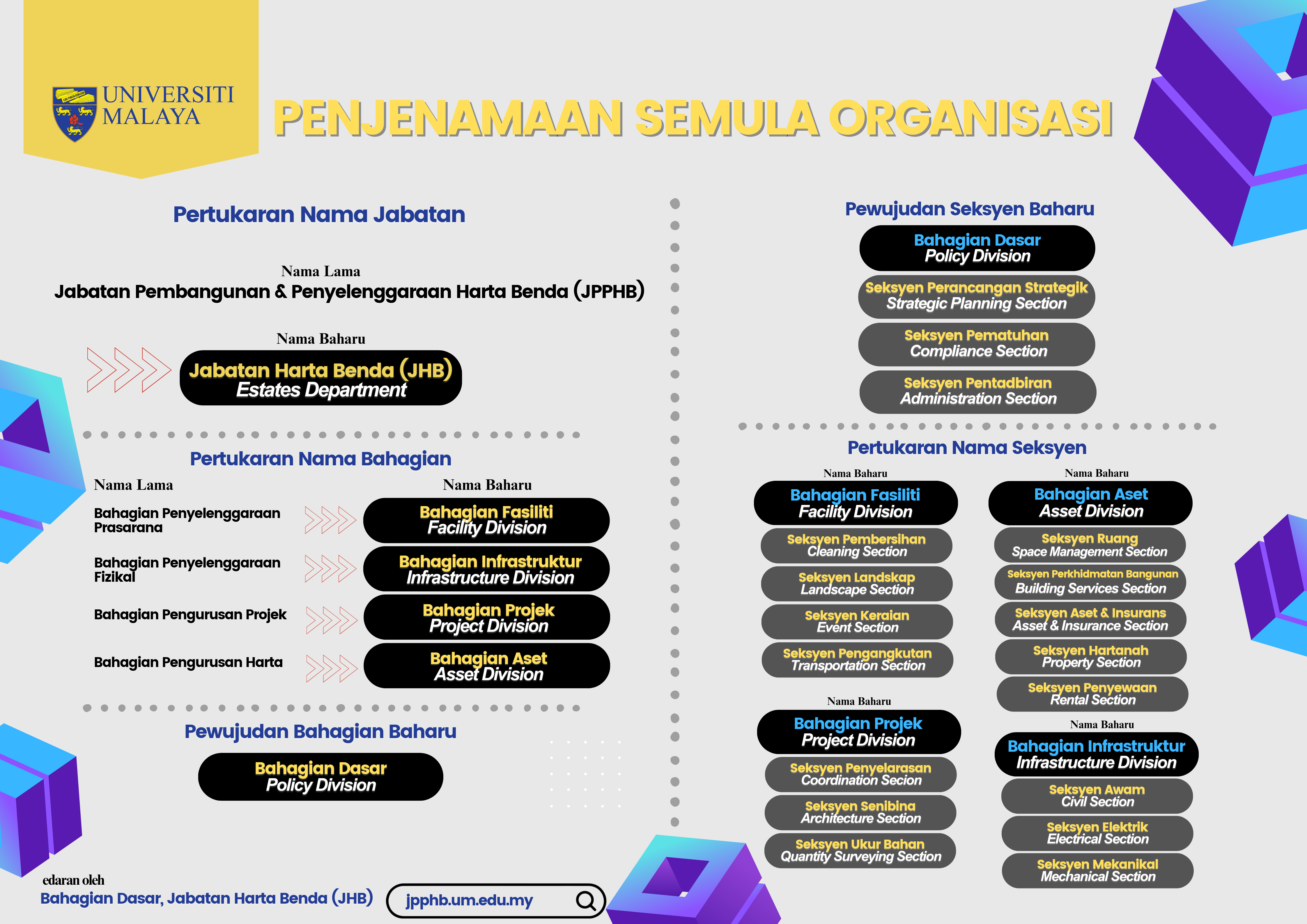 Sukacita dimaklumkan bahawa Mesyuarat Jawatankuasa Pengurusan Universiti (JKPU) pada 21.02.2024 telah meluluskan penjenamaan semula Jabatan Pembangunan & Penyelenggaraan Harta Benda (JPPHB) kepada Jabatan Harta Benda (JHB) / Estates Department.